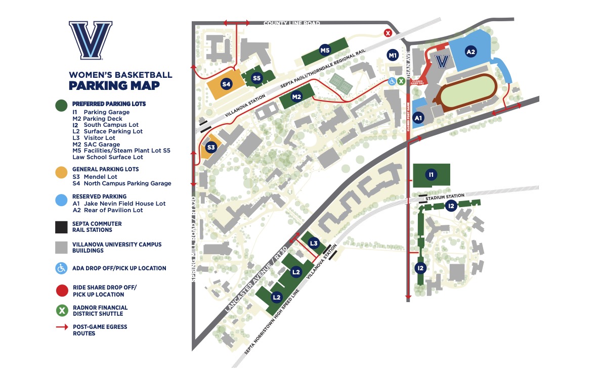 Fans may utilize the drop off and pick up zone across from the Finneran Pavilion off of N Ithan Ave, between Villanova Business School (Bartley) and Health Services Building.